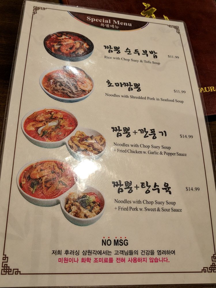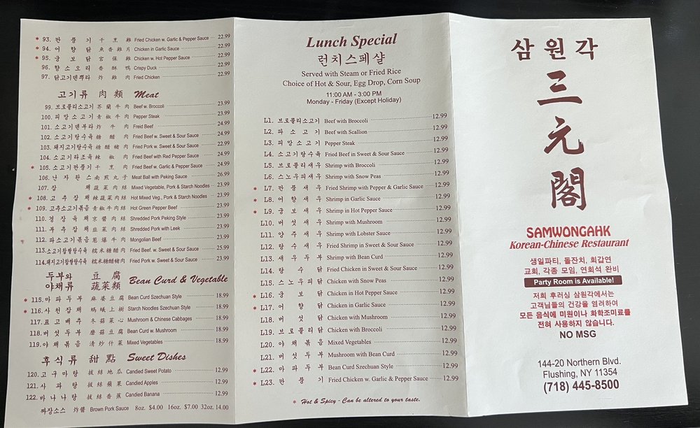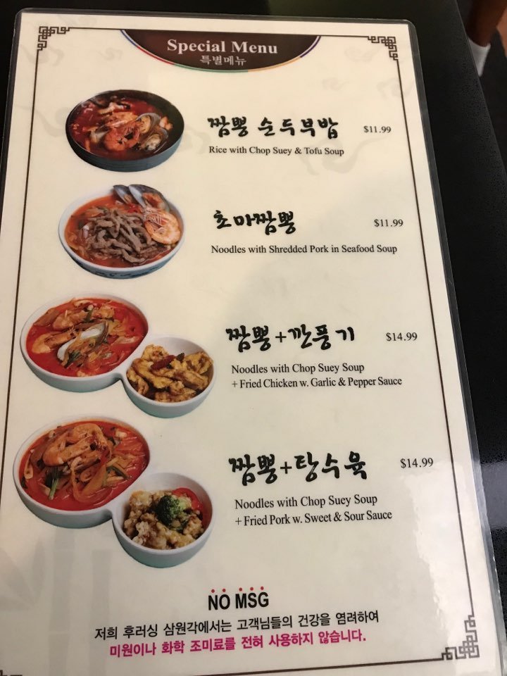 Introducing Sam Won Gahk, a Korean-Chinese-Asian fusion restaurant located in Flushing, NY. Known for its spacious and comfortable seating, the menu offers a variety of options, including vegetarian dishes. Customers praise the flavorful and well-balanced dishes, such as the fried shrimp with sour garlic and pepper sauce and the Jjam Bong seafood noodles. The restaurant provides a casual dining atmosphere with attentive staff, making it a great spot for lunch or dinner. Don't miss out on the popular jjajangmyeon and sweet and sour pork dishes. Overall, Sam Won Gahk offers a delightful dining experience with delicious food that is sure to satisfy your cravings.